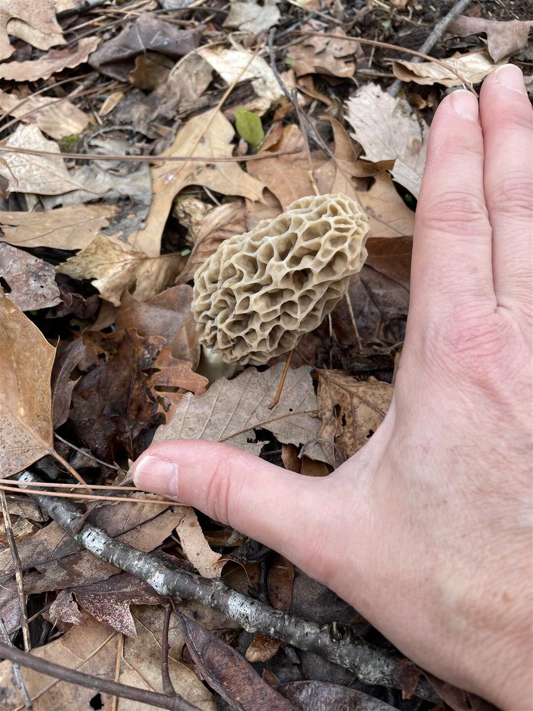 April 2, 2026. This is the largest morel of the ten around a yellow elm stump that was dropped fall 2025.
