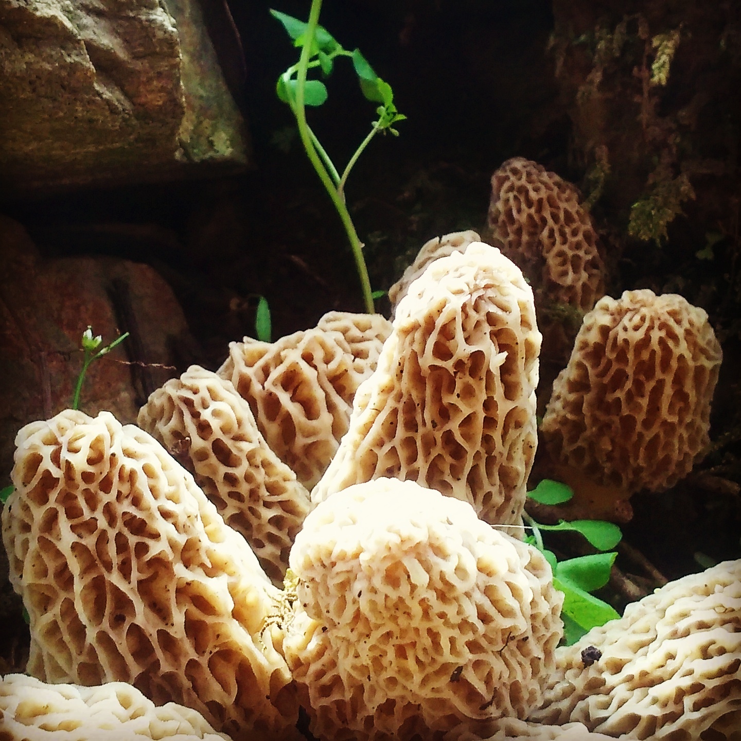 Clump of yellow morels in Minnesota